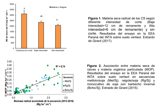 El aprovechamiento de los CS para forraje podría ser una opción viable que permita al productor recuperar o incluso capitalizar el dinero invertido. La incertidumbre es conocer en qué medida son afectados los demás servicios ambientales. Si se considera el servicio de incorporación de materia orgánica al suelo (MO) o carbono de suelo (COS), se sabe que entre el 60 y 80% de la MO del suelo proviene de las raíces, por lo que el aporte no sería afectado sustancialmente al remover la parte aérea para su utilización forrajera. Para poner a prueba esta pregunta se lleva adelante una experiencia en la EEA Paraná del INTA donde se deja el CS en pie vs. el CS cortado a diferentes alturas, dejando 6 y 12 cm de remanente en cada tratamiento, simulado una remoción para uso forrajero. El hecho de dejar dos alturas de remanente supone una intensidad de aprovechamiento diferencial que podría estar influyendo tanto en la producción de raíces como en la incorporación de MO al suelo. La MO del suelo no se afectó por el corte, considerando un período de tres años. Sin embargo, sí se afectó la producción de raíces (Figura 1). En consecuencia, el manejo de corte diferencial podría afectar a la MO del suelo en un futuro, aunque hasta el momento, no ha ocurrido. Asimismo, hubo una fuerte asociación entre la producción de raíces y la MO del suelo para distintas secuencias (Figura 2).