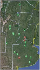 Figura 1. Mapa con ubicación de los ensayos de siembra terrestre (verde), de siembra aérea de cobertura total (azul) y de fijación biológica de Vicia villosa (rojo) pertenecientes a la Red de Cultivos de Servicios 2019.