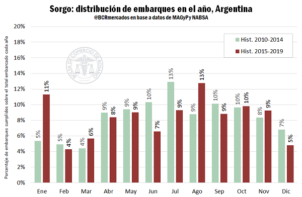 Por su parte, la distribución mensual de los embarques de sorgo argentino a lo largo del presenta menor concentración estacional que en el caso de la soja y el maíz, oscilando la participación mensual promedio entre 4 y 13%.