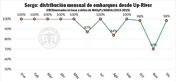 En cuanto a la participación mensual promedio del Up-River en los despachos nacionales de sorgo, esta oscila entre el 70 y 100% en los últimos 5 años. A lo largo de gran parte del año, las exportaciones de sorgo parten exclusivamente, o casi en su totalidad, de terminales ubicadas en Rosario Norte o Rosario Sur. Sólo en los meses de junio, agosto y noviembre se advierte una participación considerable de otros puertos en la originación de embarques.