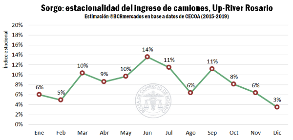 En cuanto a la estacionalidad de la entrega del sorgo en los puertos exportadores del Gran Rosario, ésta tiene su pico en los meses de mayor, junio y julio. En los últimos 5 años, en promedio, durante estos tres meses ingresó 35% de los camiones cargados con sorgo que ingresarían en el año a las terminales de Rosario Sur y Norte. La distribución del ingreso de camiones observada en los últimos años no difiere de la estacionalidad histórica para el sorgo que se entrega en el Gran Rosario.