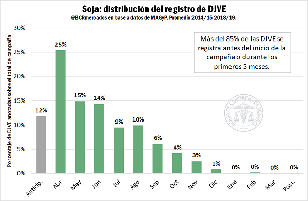 Así, la distribución promedio a lo largo de las últimas 5 campañas completas (2014/15-2018/19) evidencia un marcado pico en el mes de abril, coincidente con el avance de cosecha, donde se concentra un cuarto de las Declaraciones Juradas de Ventas al Exterior de cada campaña. Además, en los últimos años más del 85% de las DJVE se registra antes del inicio del año comercial (anticipadas) o durante los primeros 5 meses del ciclo (abril-agosto). En la segunda mitad de la campaña el registro se reduce fuertemente, presentando los últimos tres meses actividad casi nula en este sentido.
