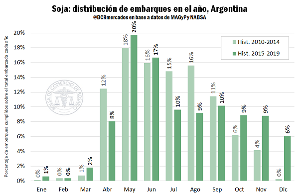 Si bien la participación promedio de marzo, un mes representativo de la cosecha de la oleaginosa en Argentina es alta, el componente estacional de los despachos de poroto ha disminuido en los últimos años. Durante los pasados 5 años calendario completos (2015-2019), en el período que va de marzo a agosto se embarcó, en promedio, el 63% de lo exportado en el año. En contraste, en el lustro anterior el mismo período de tiempo concentraba el 77% de los embarques totales, en promedio.