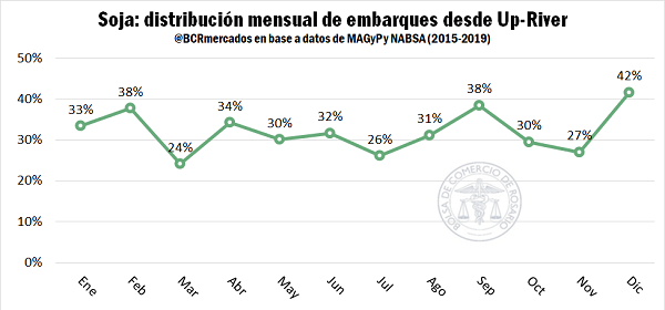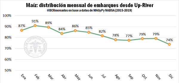 En cuanto a la participación mensual promedio del Up-River en los embarques mensuales de maíz argentino, ésta fluctúa entre 74 y 91%. El pico de participación de los puertos ubicados en Rosario Norte y Rosario Sur tiene lugar en el mes de febrero, cuando éstos despachan en promedio el 91% del volumen de maíz embarcado por Argentina en el mes. La alta participación de las terminales fluviales del Gran Rosario en los primeros meses del año cobra sentido si se tiene en cuenta que los primeros maíces disponibles cada año en Argentina son aquellos que se cosechan en el norte del país. Así, todo el maíz cosechado al norte de Rosario que se destina a la exportación, es embarcado desde las terminales del sur de Santa Fe, por cuestiones de eficiencia.