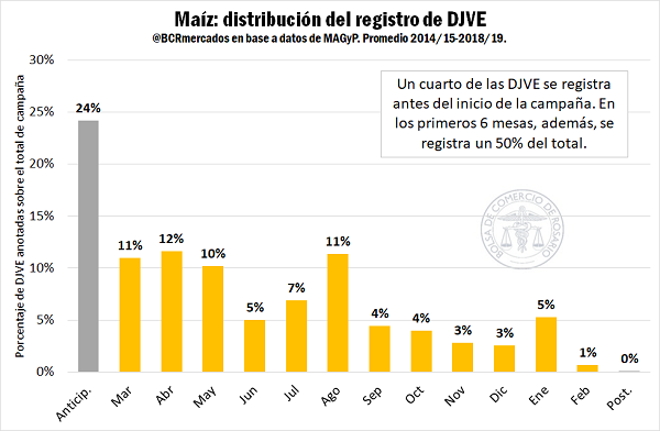 Respecto del registro de las ventas externas, la distribución promedio de DJVE a lo largo de las últimas 5 campañas completas (2014/15-2018/19) pone en evidencia la gran importancia relativa que tienen las declaraciones de venta previas al inicio formal del ciclo comercial. En las últimas campañas, el 24% de las DJVE del ciclo se registró antes del mes de marzo, mes que marca el inicio de cada año comercial. Además, en el período de seis meses que va de marzo a agosto, los exportadores registran en promedio el 50% del total anotado. Así, trascurrida la primera mitad del año comercial maicero, los exportadores tienen ya declaradas el 75% -o tres cuartos- de las ventas externas, en promedio.