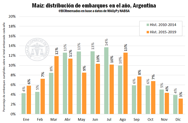 Por otro lado, analizando datos mensuales de embarques es posible identificar patrones de despacho de maíz a lo largo del año calendario. En los últimos 5 años calendario completos (2015-2019), destaca la participación mensual promedio de los meses de marzo y agosto, que en conjunto concentran el 25% de los embarques anuales promedio. Además, si se mide la participación mensual promedio de los embarques durante los primeros 6 meses de la campaña maicera (marzo-agosto), estos representan el 65% del total embarcado. Es decir, durante los últimos 5 años, en promedio, el 65% del maíz argentino exportado cada año se embarcó entre marzo y agosto.
