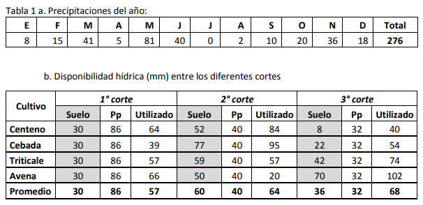 Los cortes se realizaron: el 1° el 03/06 a los 75 días desde la siembra, el 2° el 07/8 a los 130 días y el 3° el 22/10 a los 206 días. El último corte permitió evaluar en la mayoría de los tratamientos cobertura total de los cultivos, siendo en el caso de avena una alternativa válida como oferta forrajera para pastoreo directo o confección de reservas. En cada tratamiento se evaluó la producción de materia seca mediante 3 repeticiones por parcela, con medición de humedad a una profundidad variable de acuerdo a la presencia de manto calcáreo, que osciló entre 60 y 100 cm. Se evaluaron disponibilidad de nutrientes de suelo a la siembra y en los sucesivos cortes. También se efectuó el seguimiento de humedad de suelo durante el ciclo de los cultivos en la situación testigo (sin fertilización) y fertilizado con P y N. Información aportada por numerosos experimentos del INTA permiten identificar como los principales factores que regulan el crecimiento de los verdeos a la disponibilidad de agua, temperatura y fertilidad del suelo, esta última representada principalmente por nitrógeno y fosforo.