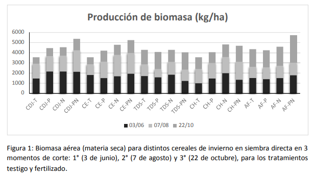 En el presente trabajo, realizado durante 2019, se pretendió evaluar el comportamiento de las diferentes especies y nuevos cultivares recomendados para la región. Poniendo énfasis en el correcto planteo técnico (fecha de siembra, densidad), con foco en el ajuste de fertilidad mediante la incorporación de nutrientes comúnmente deficitarios en la región como son nitrógeno y fósforo y la combinación con leguminosas. Con todo esto se pretende mejorar la eficiencia con que los cultivos utilizan el agua. Los cereales utilizados fueron: Centeno Don José (CDJ), Emilio (CE), Triticale Don Santiago (TDS), Cebada Huilen (CH) y Avena Florencia (AF). El antecesor fue un cultivo cebada cervecera, durante enero se realizó el barbecho químico y las parcelas se sembraron en siembra directa (SD) el 20 de marzo, la densidad utilizada fue de 200 pl/m2 , con y sin aporte de fósforo (Fosfato monoamónico 80 kg/ha) en combinación con nitrógeno (Urea 100 kg/ha).