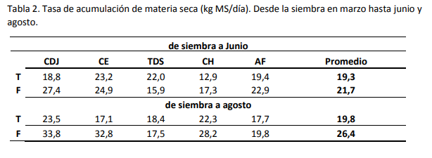 En la Tabla 2 se presenta la tasa de acumulación de biomasa (kg MS/día) de los diferentes cultivos para la situación sin fertilización (T) y para la dosis combinada de fósforo y nitrógeno (F). Se destacó el crecimiento inicial de los centenos independientemente de su ciclo tuvieron la mayor tasa de acumulación de biomasa. En este momento del año (otoño) la fertilización generó una respuesta promedio que superó en un 12% a la situación testigo. Durante el rebrote (invierno) para la situación testigo se destacó el crecimiento de CDJ (centeno de ciclo intermedio-corto) y CH. La fertilización en el CE permitió prácticamente duplicar su tasa de crecimiento con respecto al que no se fertilizó. La respuesta promedio al uso de fertilizantes se correspondió con un incremento del 33 % de la tasa de acumulación de biomasa.