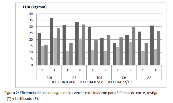 En la Figura 2 se puede observar la eficiencia de uso del agua de los cultivos (EUA) para la situación testigo sin fertilizante (T) y fertilizado con fósforo y nitrógeno (F) para 3 fechas de corte 3/6 (1° corte), 7/8 (2° corte) y 22/10 (3° corte). Los cultivos fertilizados tuvieron las mayores EUA, donde el centeno Don José fue el cultivar con mayor valor (más de 35 kg MS/mm ha). En general las eficiencias promedio fueron mayores en la primera fecha de corte (28 kg MS/mm ha), en el segundo corte fueron las más bajas (15 kg MS/mm ha) donde nuevamente se destacaron los centenos fertilizados (21 kg MS/mm). En el tercer corte se incrementaron nuevamente las eficiencias (23 kg MS/mm) con un marcado contraste en términos generales para la situación T vs F.