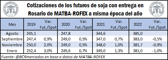Tal como puede evidenciarse en la imagen inmediatamente anterior, los valores del cereal se encuentran alineados con los movimientos cíclicos de los precios. Sin embargo, debe destacarse la importancia del análisis de las tasas de interés que resultan entre la comparativa de las cotizaciones de los futuros y el valor spot, puesto que este valor refleja en cierta medida las necesidades de abastecimiento de los granos en los diferentes meses de entrega.