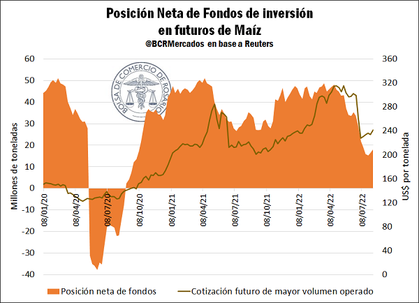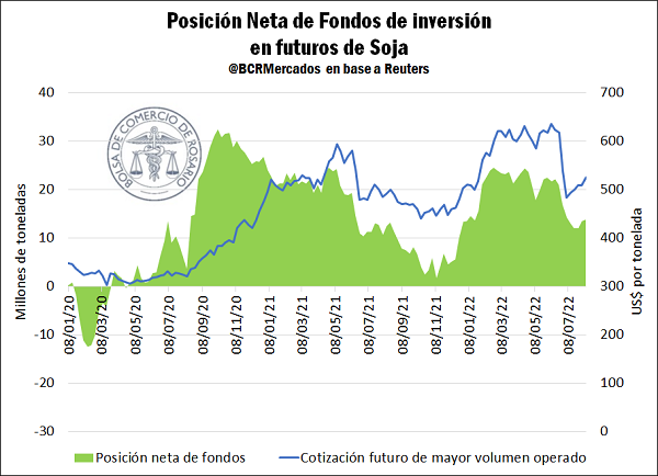En las últimas semanas dentro de la operatoria de futuros de soja y maíz en el mercado de referencia, Chicago, se ha tornado muy relevante el posicionamiento de los fondos inversores en los derivados de la oleaginosa y el cereal. Más específicamente, el descenso en el volumen de compras netas de estos organismos de cara a la presentación del informe mensual de Oferta y Demanda Mundial (WASDE, por sus siglas en inglés) por parte del Ministerio de Agricultura de los Estados Unidos (USDA) generó caídas en las cotizaciones internacionales de los granos gruesos. Además, debe destacarse que entre los factores que también impactaron sobre las decisiones de posicionamiento de los fondos se encuentra la proximidad de la cosecha norteamericana, que viene con perspectivas positivas a pesar de haber transitado algunos períodos de sequías y clima caluroso, y las subas en las tasas de interés de referencia en los EE. UU como medida para contrarrestar la inflación.