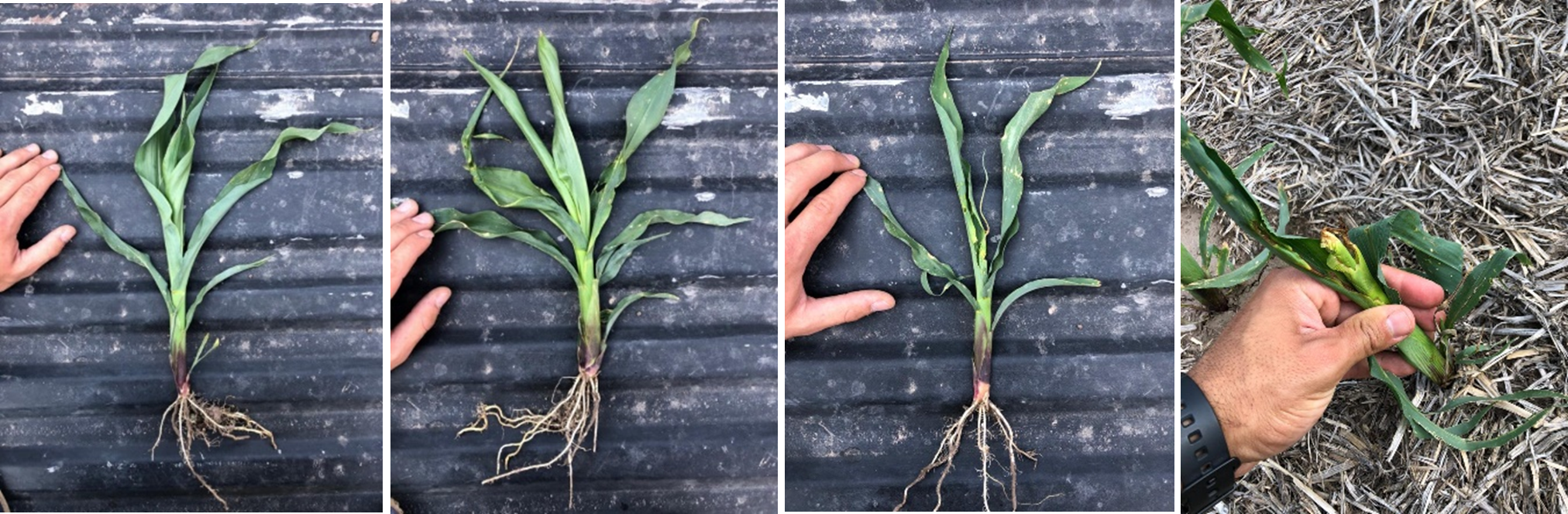 Foto (de izq. a der.): testigo sin daño; plantas con niveles de Severidad 1, 2 y 3, respectivamente.