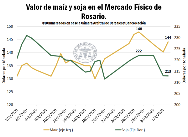 Los precios internos del maíz en la semana pasada parecieron soportar las duras caídas en el mercado CBOT, incluso ensayando una suba, relacionada con la necesidad puntual de mercadería del sector exportador. Sin embargo, en la última semana, los precios se contagiaron parcialmente de un Chicago que parece no menguar en su tendencia a la baja, por la caída en el precio del petroleo y el fortalecimiento relativo del dólar estadounidense, sumado a la presión estacional de la cosecha en nuestro país y a la ventana de buen clima que se prevé en el corto plazo y que permitiría acelerar la trilla. Así, entre el jueves 26 y el día de ayer, el precio pizarra de la Cámara Arbitral de Cereales cedió un 2% medido en pesos, para cerrar este último día en $ 9.300/t, una caída menor a la experimentada en el mercado CBOT en la semana. Por otra parte, el precio de la soja también sufrió una merma similar, contagiada también de la caída en el mercado de referencia y por la generalización en la cosecha de la soja de primera en la zona núcleo, ubicándose el precio pizarra en $ 13.740/t al jueves último.