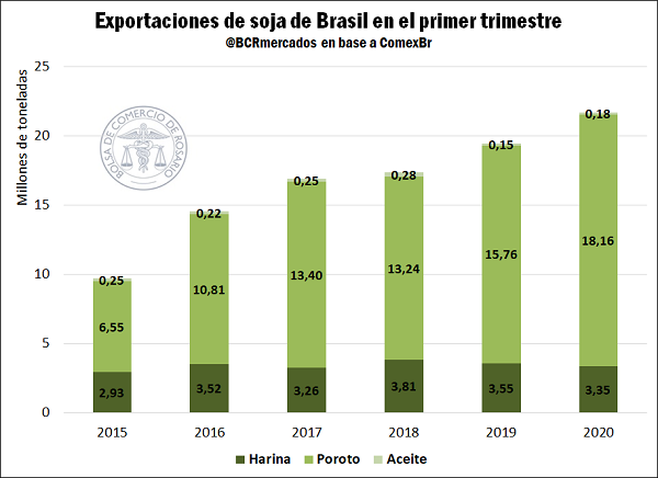 La fuerte demanda por parte de China y la dilación en la cosecha por las lluvias en febrero coadyuvaron a que los envíos se concentren en el mes que acaba de finalizar. Del total exportado por Brasil, China concentró 9,9 Mt, un aumento del 47% en comparación con las exportaciones al mismo destino en marzo de 2019.