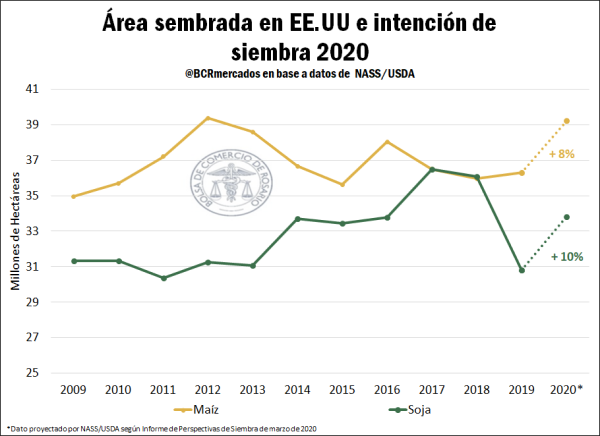 El Departamento de Agricultura de Estados Unidos (USDA), dio a conocer esta semana datos claves de intenciones de siembra en EE.UU. para la campaña 2020/21. Por un lado, se espera que el cultivo de soja presente una superficie sembrada de 33,8 millones de hectáreas, resultando un valor inferior tanto a la estimación dada a conocer por el organismo hace menos de dos meses en el Foro de Perspectivas Agrícolas (34,4 Mill Ha), como al promedio de las proyecciones privadas que se ubicaron en 34,3 Mill Ha. No obstante, dicho valor estimado implica un repunte importante de las 30,8 Mill Ha sembradas la campaña 2019/20, detentando un incremento de 3 Mill Ha. De esta forma, se volvería a valores de siembra alcanzados en los años 2014-2016.