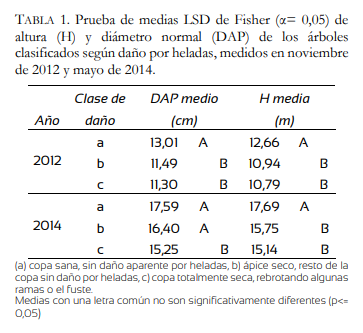 En este estudio los árboles de mayor tamaño no presentaron daños visibles por efecto de la helada; al contrario de lo que ocurrió con los árboles de menor tamaño, en los que se observaron daños en el ápice y en la copa por efecto de la helada al momento de la clasificación.