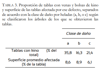 Las venas y bolsas de kino se observan en áreas próximas a lesiones en la madera (Shield y Mastrandrea, 2007), que entre otras causas pueden estar relacionadas al efecto de las heladas, como células aplastadas o deformadas (Stöckli y Schweingruber, 1996a, 1996b; Gurskaya y Shiyatov, 2006) por congelamiento del agua dentro y fuera de las células luego de un rápido descenso de la temperatura (Snyder y de Melo-Abreu, 2010). Por otra parte, la presencia de kino puede indicar una respuesta de defensa a lesiones en la madera relacionadas con el efecto de diversos factores externos como las heladas (Wilkes, 1986; Jacobs 1986; Hillis, 1987). Las propiedades antisépticas de los taninos condensados presentes en el kino (Núñez, 2011) probablemente evitaron el ingreso de patógenos causantes de pudrición y no se registró ese defecto en ninguna tabla de los árboles sin daños visibles. En las tablas de árboles de menor tamaño y con daños visibles por heladas, los defectos más frecuentes fueron grietas y pudrición, que puede hacerse evidente varios meses después de las heladas donde hay células dañadas por frío (Broschat, 2013). También las grietas en las tablas pueden formarse por daños anatómicos causados por las heladas (Pearce, 2001; Gurskaya y Shiyatov, 2006; Schweingruber, 2007) y aparecer aún en tablas de árboles sin daños visibles por frío, tal como se observó en este estudio. Aunque Crane (2010) recomienda evaluar el daño por heladas de 2 meses a 6 meses luego de su ocurrencia, y en este estudio la clasificación de los árboles según la escala visual de daño por heladas se hizo cuatro meses después de su ocurrencia, mientras que la evaluación de defectos en la madera se realizó dos años después, el uso de esta escala visual para clasificar eucaliptos expuestos a heladas probablemente debería aplicarse inmediatamente después del evento meteorológico y realizar un seguimiento de la evolución de los síntomas visibles en los meses siguientes.