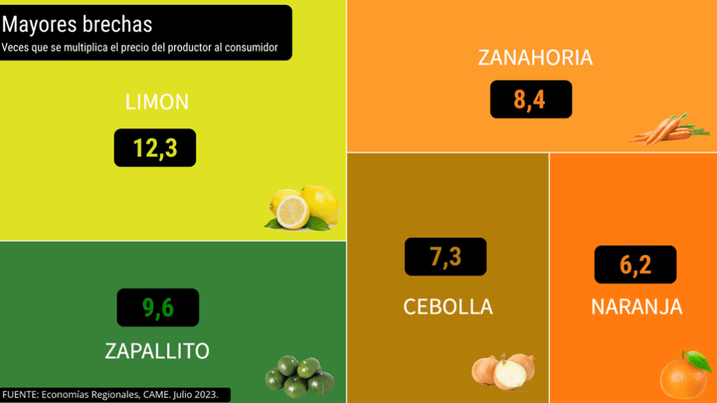 El limón (12,3 veces), el zapallito (9,6), la zanahoria (8,4), la cebolla (7,3) y la naranja (6,2 veces) fueron los cinco productos que presentaron mayor diferencia entre los precios de origen y destino.En ese sentido, el limón fue el alimento con mayor brecha entre el productor y el consumidor por cuarto mes consecutivo. Es porque se le paga muy poco al productor y no se observaron variaciones en origen, es decir, se mantiene el monto desde comienzo de cosecha, que fue en abril. Por otra parte, hay una caída de exportación, está sobre ofertado, y se ajusta por el productor. Mientras, en góndola el aumento de precios respecto de junio fue del 1%, por incremento de costos de salarios, energía, fletes, entre otros, para los galpones de empaque y cadena de comercialización.
