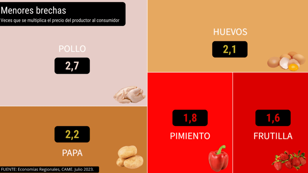 Entre los productos que presentaron menor diferencia entre el precio que recibió el productor y el que pagó el consumidor se encuentran dos de origen animal y tres frutihortícolas.
