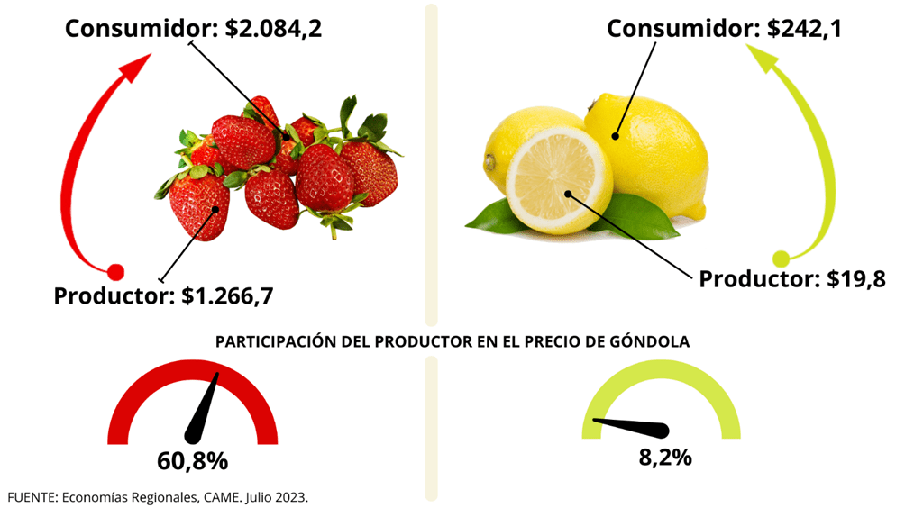 En promedio, la participación del productor explicó el 26,9% de los precios de venta final. La mayor participación la tuvieron los productores de frutilla (60,8%), mientras que la menor fue para los de limón (8,2%).