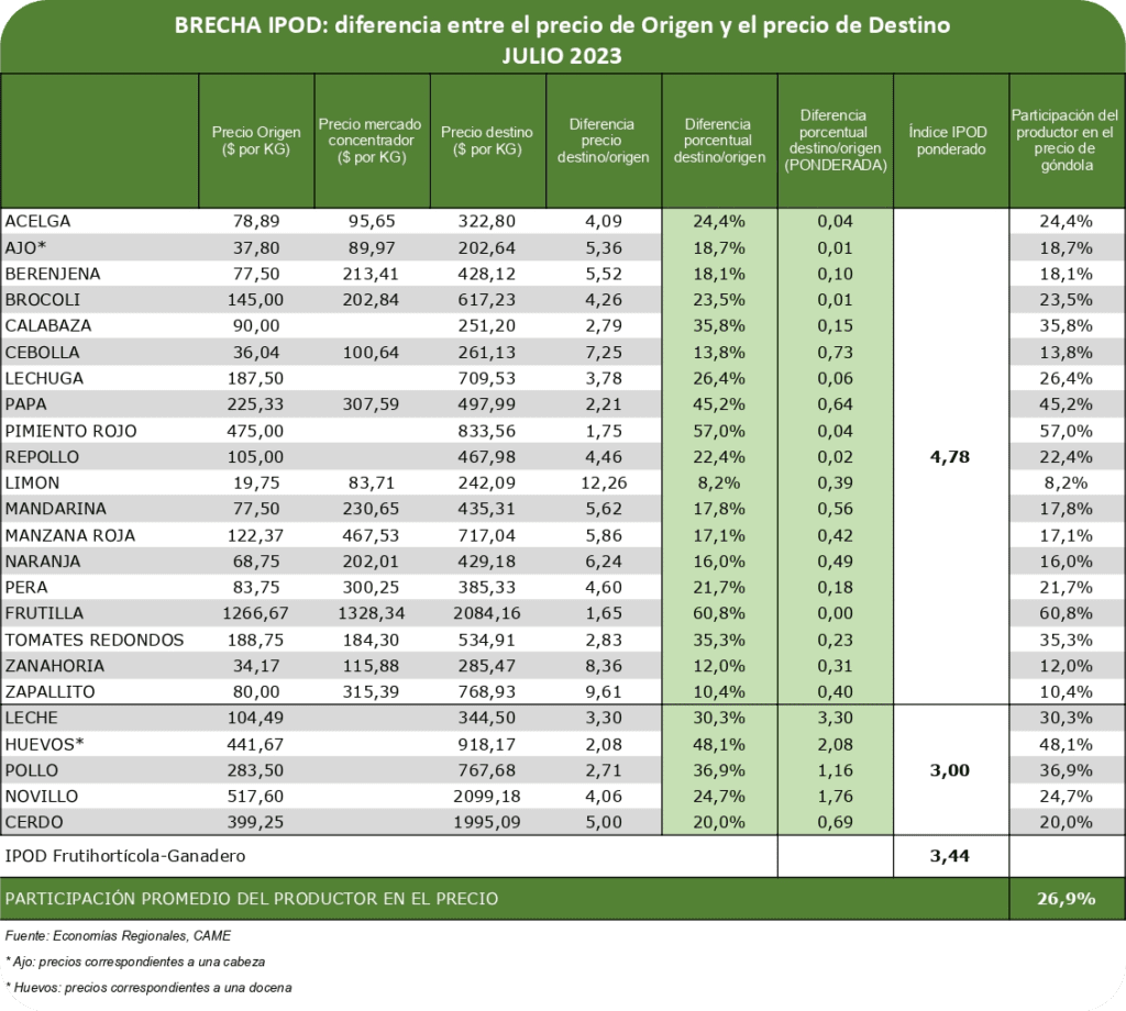 Según el Índice de Precios en Origen y Destino (IPOD) elaborado por el sector de Economías Regionales de la Confederación Argentina de la Mediana Empresa (CAME), en julio los precios de los agroalimentos se multiplicaron por 3,4 veces de la chacra (origen) a la góndola (destino). Es decir, el consumidor pagó $3,4 por cada $1 que recibió el productor.