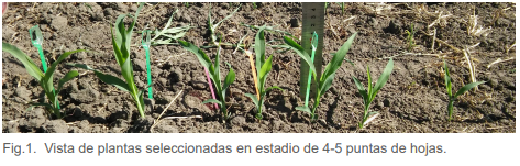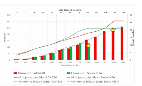 Se seleccionaron 10 plantas por parcela (Fig. 1) dispuestas en un diseño en BCA con tres repeticiones. El momento de floración se expresó en base a sumas térmicas diarias acumuladas (°Cd) desde el momento de la siembra. La regresión de altura en función del tiempo se calculó utilizando un ajuste polinomial de tercer orden con el programa Excel. La arquitectura se estimó midiendo largo y ancho de entrenudos.