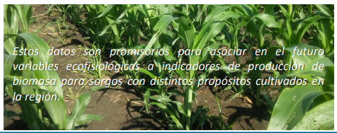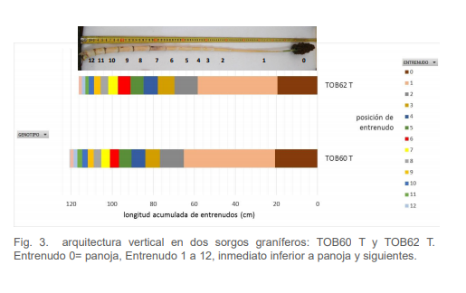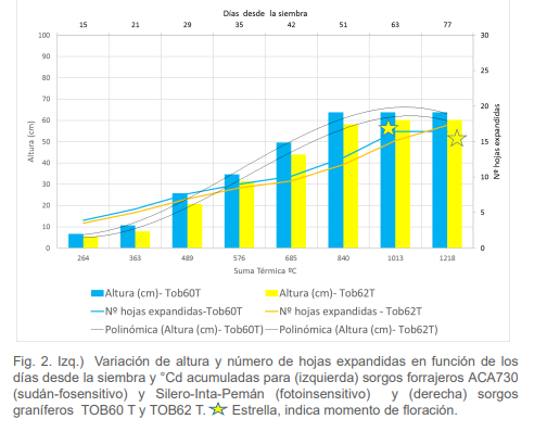 Los principales factores del ambiente que modifican el desarrollo del cultivo son la temperatura y el fotoperiodo. A nivel genético existen genes que regulan la respuesta al fotoperiodo (Ma) y altura, longitud y ancho de entrenudos (Dw). El objetivo fue estudiar comparativamente en forma descriptiva el desarrollo (tasa de aparición de hojas expandidas y de altura, días a floración) en dos híbridos de sorgos para silo: ACA730 (sudánfosensitivo) y Silero-Inta-Pemán (fotoinsensitivo) y el desarrollo y arquitectura (largo, ancho, área y volumen de entrenudos) en dos sorgos graníferos: TOB60 T y TOB62T sembrados en INTA Corrientes el 19/12/2017.