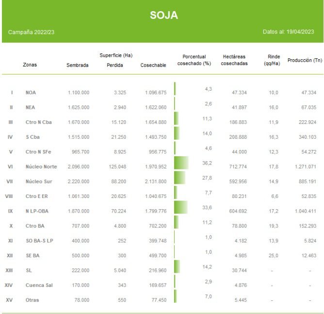 Durante los últimos siete días cobró fluidez la cosecha de soja de primera, el avance de la trilla alcanzó el 24,4% de la superficie apta, con un rendimiento medio de 16,1 qq/Ha. Sobre el Núcleo Norte se registró un avance de cosecha de soja de primera de 55%, con un rinde medio de 17,8 qq/Ha. Asimismo, en el núcleo sur la recolección de la oleaginosa alcanzó al 42% de la zona apta, con un rendimiento medio semanal de 15 qq/Ha. En paralelo, la trilla sobre el Norte de La Pampa-Oeste de Buenos Aires, alcanzó el 48% de la superficie de soja de primera sembrada, con un rendimiento medio de 17,2 qq/Ha, valor por debajo a lo esperado.