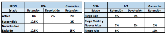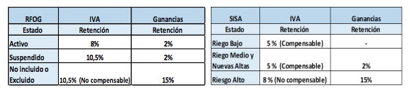 - Se fijan diferentes alícuotas a aplicar, las que variarán, según las operaciones que se realicen y el estado que cada sujeto tenga en el sistema de calificación, entre el 5% y el 16%, o incluso el 100% para el caso de sujetos en estado inactivo. A los productores de cereales y oleaginosas y legumbres secas, excepto arroz, categorizados con “Estado 1” se les retendrá el 5% con una devolución también del 5% en un plazo no especificado (si bien, cuando se anunció la medida, se indicó que el mismo sería de hasta 45 días). En lo que respecta a los productores con “Estado 2”, se les retendrá el 7% con una devolución del 6%, mientras que a aquellos comprendidos en el “Estado 3” les corresponderá una retención del 8% del IVA, sin devolución Para los productores de arroz, en el “Estado 1” la retención será del 10% también con devolución total, mientras que en el “Estado 2” se aplicará un 14% con devolución del 12%. En el “Estado 3” la retención de IVA se fijó en el 16%, sin devolución.
