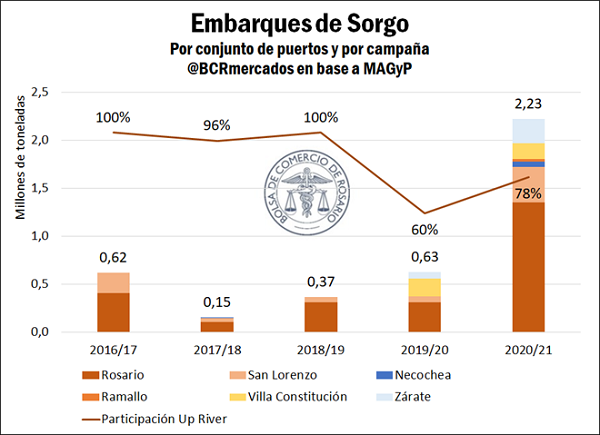 Considerando a nuestro país como exportador de cerca del 20% del sorgo del mundo, cabe destacar el peso que tiene el Up River en la logística sorguera argentina. Más de 1,72 Mt de sorgo fueron exportadas por los puertos del Gran Rosario en la campaña pasada. Con un comercio mundial de 11,55 Mt en ese año comercial, el Up River es entonces responsable del 15% de las exportaciones mundiales de sorgo.
