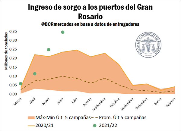 El nodo portuario del Gran Rosario emerge entonces como el segundo nodo que más embarca sorgo en el mundo, sólo por detrás de Houston-Galveston, en los Estados Unidos. En este importante nodo de Texas embarcó 5,4 Mt en la campaña anterior, cerca del 47% de las exportaciones globales de sorgo.