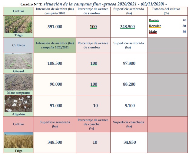A mayor ritmo continuó la implantación del cultivo de sorgo granífero, algodón y arroz. Con el transcurso de los días, las buenas condiciones climáticas y de la humedad del horizonte Ap de los perfiles de los suelos, la implantación de la soja temprana adquirió más relevancia, estimándose una intención de siembra de 950.000 ha, representando aproximadamente un 5,5 % más, que la superficie lograda la campaña pasada, que fue de 897.500 ha. Las aplicaciones de herbicidas, para el control de malezas en cultivares o en barbechos, tuvo menor desarrollo.