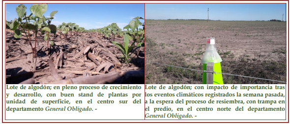 Período en el que se retomó el proceso de siembra, a medida que las condiciones de los suelos lo permitieron. También se resembraron parcial o 6 totalmente los lotes afectados por las inclemencias climáticas, de la semana anterior. Continuó el monitoreo de las trampas en los predios destinados a algodón, como así también la prevención del ingreso del picudo a los mismos, realizándose las aplicaciones en los bordes, en caso de necesidad. La Secretaría Nacional de Sanidad Vegetal (SENASA) estableció según Resolución SENASA N° 74 de 2010 como fecha obligatoria de siembra, los siguientes períodos: • “1° de octubre al 15 de noviembre Domo Oriental (Departamento General Obligado, Departamento Garay, Departamento San Javier, Departamento Vera al Este de la Ruta Provincial Nº 3 y el Sur de la Ruta Nacional Nº 98)”. • “1º de noviembre al 15 de diciembre Domo Occidental (Departamento 9 de Julio, Departamento San Cristóbal, Departamento Las Colonias, Departamento Vera al Oeste de la Ruta Provincial Nº 3 y el Norte de la Ruta Nacional Nº 98)”.
