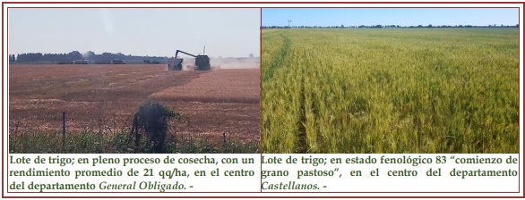 Hasta la fecha se detectó: • un 40 %, con buen desarrollo en las diferentes etapas y estado sanitario, • un 30 %, en estado regular, con el transcurso de las semanas, ante la decreciente disponibilidad de agua útil, evidenciaron síntomas de déficit hídrico, observándose lotes no uniformes, poco desarrollo en altura de las plantas, con menor cantidad de macollos y de espigas, • el restante 30 %, se halló en estado malo, con inconvenientes en los stands de plantas por unidad de superficie, coloración pálida, no uniformes, ante ausencia de precipitaciones, poco desarrollo de estructura, altura de planta y espigas chicas. Con el transcurso de los días la evolución de los estados fenológicos, que como se enunció se aceleró, comenzó el movimiento de equipos y cosechadoras a diferentes ritmos en los departamentos del norte y centro del área de estudio.