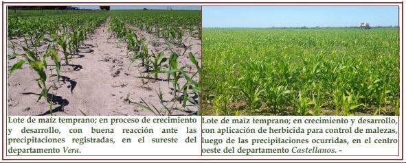 Con las precipitaciones de la semana anterior se observó el cambio y la reacción del estado de los maizales, revirtiendo los síntomas provocados por el déficit hídrico. De esta manera el cultivo continuó su crecimiento y desarrollo normal, no presentando inconvenientes por la presencia de plagas o enfermedades. Se observaron los siguientes estados fenológicos: V “estados vegetativos”, V3 (3º hoja desarrollada), V4 (4º hoja desarrollada), V5 (5º hoja desarrollada), V6 (6º hoja desarrollada), V7 (7º hoja desarrollada), V8 (8º hoja desarrollada), V9 (9º hoja desarrollada) y en lotes más avanzados, V10 (10º hoja desarrollada).