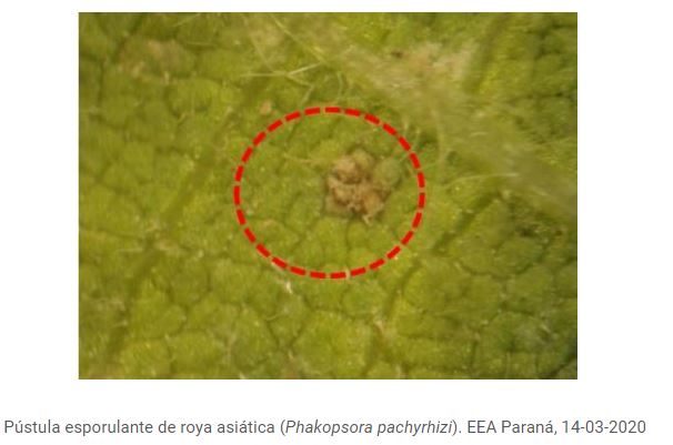En la provincia de Entre Ríos se detectó roya asiática de la soja (Phakopsora pachyrhizi) en los dptos. Paraná y Uruguay, el día 6-04-2021. Con baja incidencia y mucho más tarde que lo habitual, la enfermedad foliar se localizó en la EEA Paraná del INTA, Oro Verde (Ing. Ignacio Vicentin), en Estación Sosa (Ing. Daniel Volpe) y en Herrera (Ing. Analía Curti).