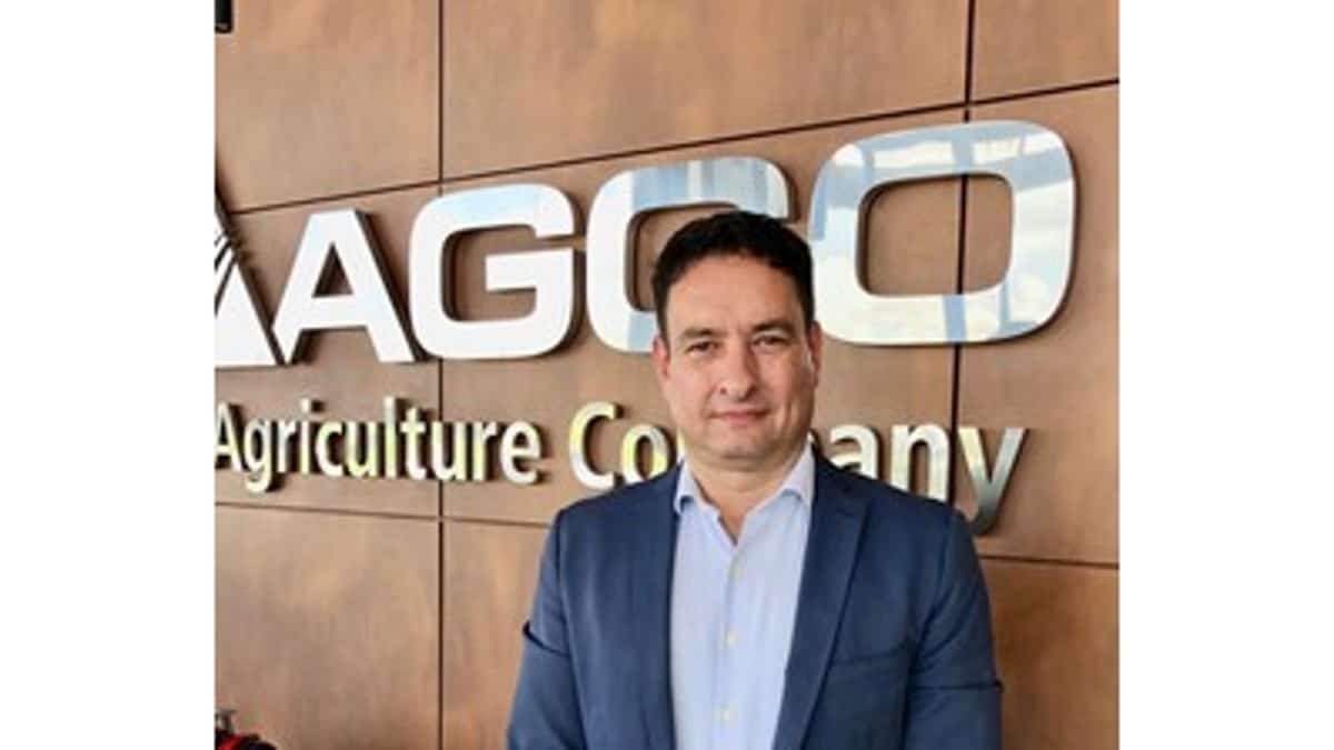 Ejecutivo del sector agrícola frente al logo de AGCO en contexto de tecnología y producción agropecuaria