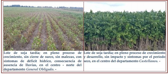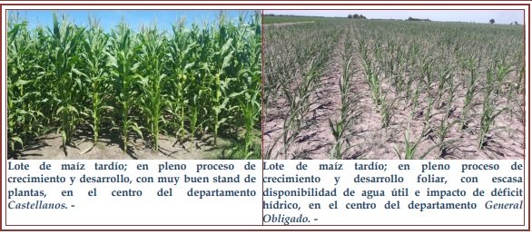 Tales escenarios climáticos concretaron los pronósticos enunciados en el informe anterior, observándose síntomas de déficit hídrico en el área de estudio, que repercutieron fundamentalmente en los cultivos tardíos, demostrando la heterogeneidad e irregularidad en la distribución geográfica de las precipitaciones de los meses de enero y febrero de 2020. En particular, en los cultivares mencionados, dada la etapa fenológica de mayor demanda de agua útil, para un desarrollo y crecimiento normal en que se encontraban.