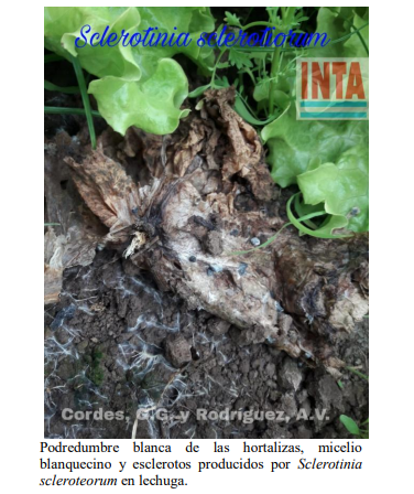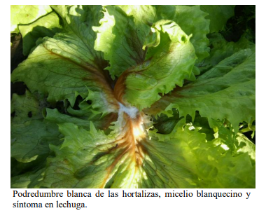 - Podredumbre blanca de las hortalizas causada por Sclerotinia scleroteorum. Esta enfermedad se caracteriza por producir como sintomatología una pudrición blanda acuosa acompañada como signo de una producción de micelio blanco abundante y la formación de esclerocios compactos de coloración negra. Estos últimos le permiten pasar las condiciones desfavorables por más de 3 años y diseminar la enfermedad en el campo. El hongo puede establecerse y destruir completamente la corona de la planta, las hojas más viejas se marchitan y la pudrición avanza hasta colapsar la planta completa, produciendo pérdida de plantas. Para el manejo de la enfermedad utilizar siempre un enfoque preventivo. Remover plantas con síntomas incipientes puede resultar lento y costoso en mano de obra, pero es una de las medidas más importantes para evitar el incremento de la enfermedad y reducir el inoculo en campo.