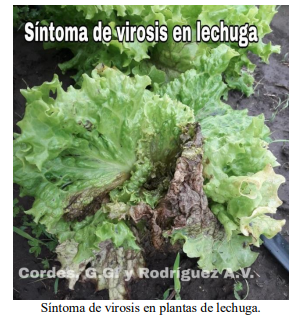 - Virosis en plantas de lechuga, asociado con bacteriosis. En este caso se observaron plantas con las dos enfermedades asociadas. En el caso de virosis se sospecha del TSWV causal de la Peste Negra, mientras que en el caso de la bacteriosis el posible agente causal sea Pectobacterion caratovorum o Xanthomonas campestris pv vitians. En lo que respecta a la virosis es fundamental la utilización de semilla sana, mientras que en el caso de las bacteriosis se recomienda la rotación y evitar el monocultivo de lechuga, cuando se detectan niveles severos de la enfermedad.