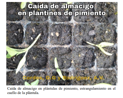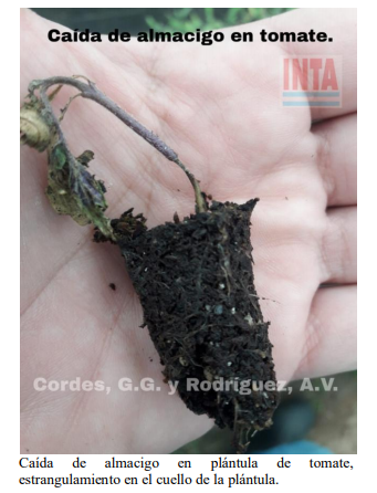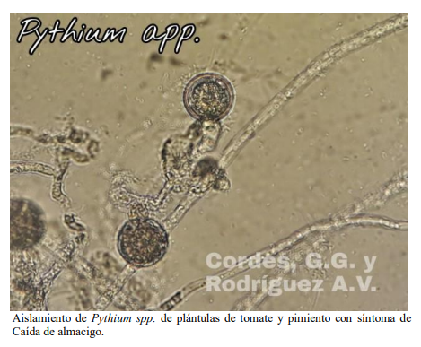 - Caído de almacigo. Esta enfermedad se observó en plantines de tomate y de pimiento. Son muchos los agentes causales que puede producir esta enfermedad y en su gran mayoría se encuentran en el sustrato. Para la identificación del agente causal, fue necesario llevar muestras de plantas con la sintomatología característica de esta enfermedad (estrangulamiento del cuello de la planta), al laboratorio de fitopatología. En el laboratorio, se procedió a la realización de cámaras húmedas. Después de 72hs, se continuó con la identificación del agente causal mediante la realización de preparados, para ser observados en microscopio, de los micelios encontrados en las plántulas con sintomatología antes mencionados. A través del microscopio se pudo identificar la presencia de Pithium spp. como causal de la caída de almacigo. Este patógeno, es un habitante del suelo y para evitar la aparición de esta enfermedad se recomienda: rotación con especies no susceptibles, la aplicación de productos químicos en el cuello de la planta o sustrato y la utilización de biocontroladores como Trichoderma.