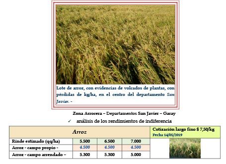 Los rendimientos registrados en la zona fueron de 17 – 18 qq/ha en los mínimos y los máximos de 34 – 36 qq/ha. Se recuerda que la fecha límite de destrucción de los rastrojos del cultivo, sería el 31 de mayo para la zona este y el 15 de junio para la zona oeste. En el área algodonera oeste, no han cambiado las condiciones climáticas desfavorables y con ello la imposibilidad de la realización de actividades Lote de arroz, con evidencias de volcados de plantas, con pérdidas de kg/ha, en el centro del departamento San Javier específicas. La realidad muy compleja de por sí, sin actividades, pasó a pérdidas e inactividad, que con el transcurso de los días se irían agravando. El proceso de cosecha logrado hasta la fecha fue del orden del 10 %, los rendimientos promedios mínimos fueron de 10 – 12 qq/ ha y los promedios máximos de 20/21 qq/ha, con partes de lotes puntuales de 25 – 26 qq/ha. Se observaron los siguientes estados fenológicos: en R “estados reproductivos” desarrollo de cápsulas, M “maduración”, M1 (primer cápsula abierta), M2 (60 % de cápsula abierta) y madurez fisiológica.