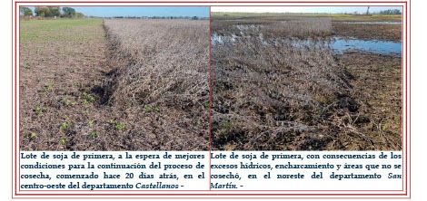 Luego de dos días con condiciones de inestabilidad climática, con alta nubosidad, altos porcentajes de humedad ambiente, temperaturas diarias medias a levemente altas, alta nubosidad, período muy húmedo y con precipitaciones, cuyos montos pluviométricos oscilaron entre 05 a 60 mm, impactando nuevamente en mayor proporción a los departamentos del norte santafesino; se sucedieron días soleados con condiciones de estabilidad, sin nubosidad, leves vientos del cuadrante sur – suroeste que posibilitaron, con el transcurso de los días, el movimiento de equipos y cosechadoras que reanudaron la actividad y lentamente se fue incrementando el ritmo y el progreso de cosecha, interrumpido por un largo tiempo. Las particularidades observadas en los distintos departamentos, fueron las áreas con encharcamientos y con sectores anegados en distintas zonas. Así como también las huellas dejadas por las maquinarias, con el impacto y deterioro físico de los suelos.