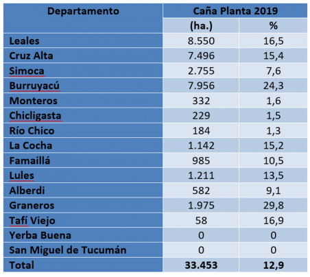 El total de la superficie renovada para la presente zafra fue 33.453 ha., lo que equivale a un 12,9% del área total cultivada y proyectada a cosecha para esta zafra. Los departamentos que muestran mayor renovación son los que incluyen productores o empresas cañeras de mayor escala económica y de base productiva diversificada, observándose menor renovación del cañaveral en los productores pequeños y medianos.