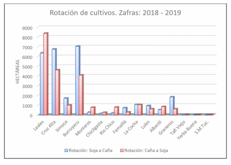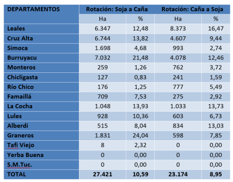 Tabla 1: Comportamiento departamental de las rotaciones de cultivos, soja – caña y viceversa, en Tucumán. Zafra 2019.