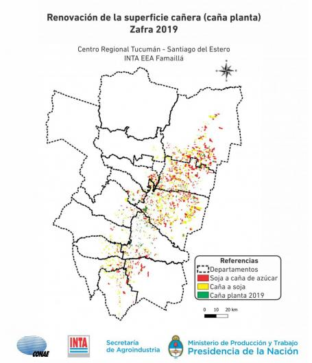 El cañaveral tiene generalmente una vida útil de cinco años. El período que va desde la plantación hasta la primera cosecha se denomina “caña planta”. El Laboratorio de Sistemas de Información Territorial del INTA EEA Famaillá, pudo determinar la dinámica de renovación de cañaveral tucumano en la campaña de plantación 2018 – zafra 2019. El presente trabajo permitió establecer la superficie con caña planta para la presente campaña 2019, como así también discriminar los lotes que realizaron rotación con soja entre las dos campañas agrícolas. Esta información se consiguió a través del procesamiento de imágenes satelitales provistas por la CONAE (Comisión Nacional de Actividades Espaciales de Argentina).