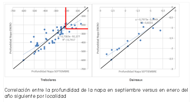 El técnico CREA explicó que existe una muy elevada correlación entre la posición de la napa presente en septiembre respecto de la registrada en el mes de enero del año siguiente (período crítico en el cual se definen los rendimientos de muchos cultivos de granos gruesos).