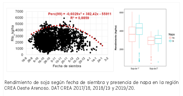 En lo que respecta a soja, por ejemplo, registros de las últimas tres campañas del DAT CREA, correspondiente a situaciones climáticas contrastantes, muestran que los mayores rendimientos en la región Sudoeste se lograron en un amplio margen de fechas de siembra, pero que la siembra en ambientes con presencia de napa logró incrementar los rendimientos promedio de manera significativa especialmente en los cultivos de primera.