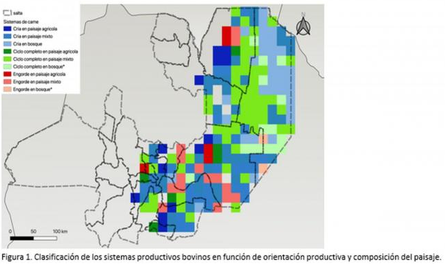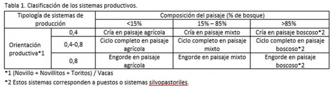 Para el primer objetivo se utilizaron datos de stock de bovinos por categoría según vacunaciones de aftosa geo-referenciadas (SENASA, 2016). Para reconocer sistemas productivos, se utilizó el índice de orientación productiva (relación entre la sumatoria de los novillos, novillitos y toritos sobre el total de vacas), y la composición del paisaje (agrícola, mixto y bosque). (Tabla 1 y Figura 1).